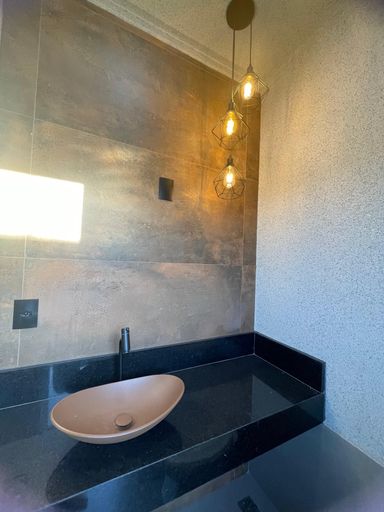 * Banheiro social com lustre, trazendo sofisticação aos detalhes